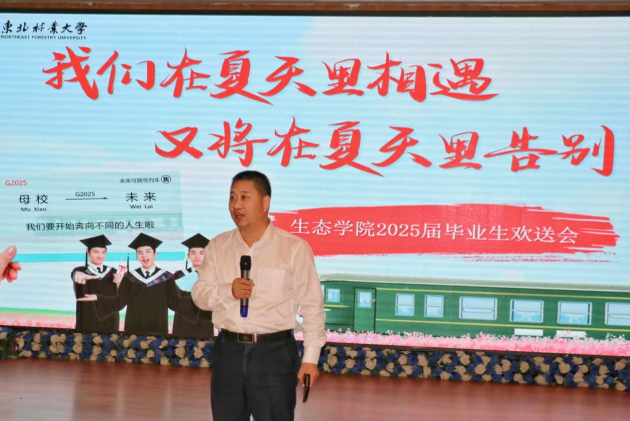 欢送会伊始,生态学院院长周旭辉为毕业生们送上临别寄语。周院长对同学们说:“同学们,在未来的人生道路上,希望你们能够始终养成并保持学习的能力,唯有持续学习,才能紧跟时代步伐,不断充实自我,让自己在社会的浪潮中始终立于不败之地;要锻炼独立思考的能力,学会理性分析,不盲目跟从,形成自己独到的见解;要拥有自主选择的能力,人生充满了无数个十字路口,要清楚自己内心真正的追求,走出属于自己的精彩人生道路;要具备审美的能力,发现生活中的美好,以美的眼光看待世界,让心灵始终保持对生活的热爱;要提升战胜困难的能力,挫折和困境不可避免,但只要你们拥有坚定的信念和顽强的毅力,就会在人生旅途中披荆斩棘;希望你们都能做一个具有使命感的人,作为生态学院的学子,要始终牢记守护生态环境、推动可持续发展的使命,将个人理想融入国家和社会的发展之中,为建设美丽中国贡献自己的力量。”随着周院长宣布欢送会正式开始,现场响起热烈的掌声。