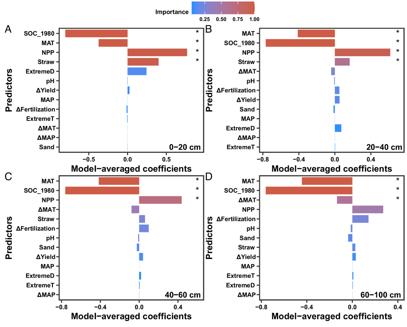 文章基于团队几十年来在土壤碳循环方面的研究工作,从长期土壤碳形成机制的新颖视角揭示了“碳增温降”是土壤有机碳形成及功能提升的双驱动机制。结果表明,过去40年我国旱地土壤剖面(0-100cm)有机碳储量净增0.74 Pg(7%),平均固存率为13.7 g m-2 yr-1。主要由于有机物料输入导致表层土壤(0-60厘米)有机碳增加(0.86 Pg),及气候变暖加速深层土壤(60-100厘米)有机碳分解(0.12 Pg)。尽管我们的研究结果显示了整个剖面土壤有机碳储量有所增加,但深层土壤中更难分解的土壤有机碳损失对长期增强农田土壤有机碳积累和实现碳中和的影响仍需进一步考量。