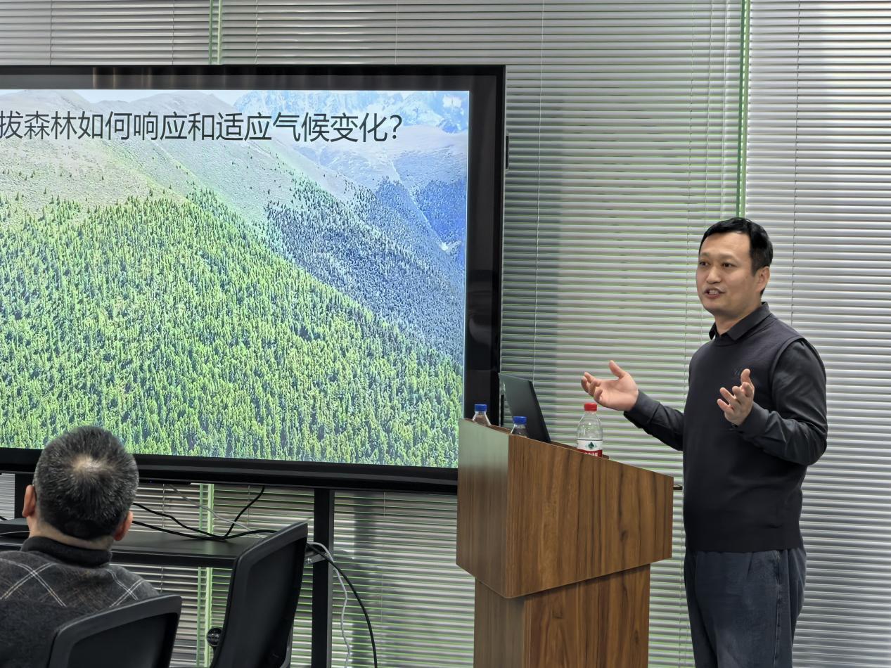 吕老师带来了题为“青藏高原海拔梯度上的森林动态研究”的精彩报告。吕老师首先介绍了青藏高原不同区域林线动态的相关研究,成果突破“温度限制林线”的传统认识,揭示了湿度因子和“邻树互助效应”对林线动态的调控作用,提高林线动态预测可靠性。接下来通过对高低海拔树木的氧同位素的分析,指出不同海拔树木水分利用效率提升的差异性机制,证明了大气CO2浓度升高对树木生长“施肥效应”的海拔分异格局,并揭示其不同气孔策略的生理生态机制。最后,通过开发树木生长稳定性指数,揭示稳定性的尺度依赖性—森林生长稳定性的维持通过牺牲个体稳定性为代价来实现,为森林动态预测提供新视角。