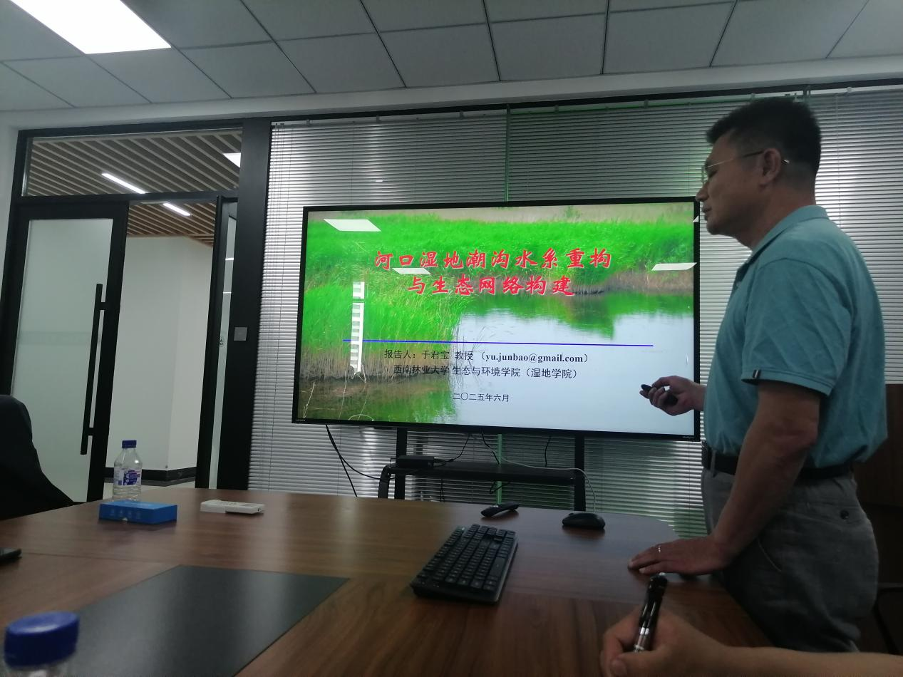 于君宝教授首先介绍了黄河三角洲河口湿地概况、重要地位与作用及当下面临的关键生态问题;紧接着,以“黄河三角洲河口湿地生态网络构建”实际案例,展示了如何以水文连通为主线,以提升黄河口湿地的食物供给能力为目的构建与优化湿地生态网络的全过程;最后,围绕入侵种互花米草的治理难题,和广大师生一起深入探讨了当下可行的治理路径与方法。