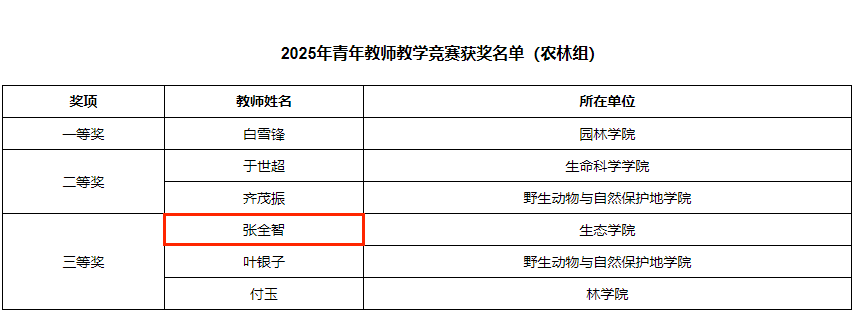 近日,东北林业大学2025年度青年教师教学竞赛决赛结果正式揭晓。经院(部)选拔推荐、校级决赛激烈角逐,我院张全智老师在农林组竞赛中表现优异,荣获三等奖。