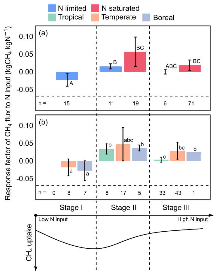 Cen, X., He, N.*, Li, M., Xu, L., Yu, X., Cai, W., Li, X. and Butterbach-Bahl, K., 2024a. Suppression of Nitrogen Deposition on Global Forest Soil CH4 Uptake Depends on Nitrogen Status. Global Biogeochemical Cycles, 38(7): e2024GB008098.