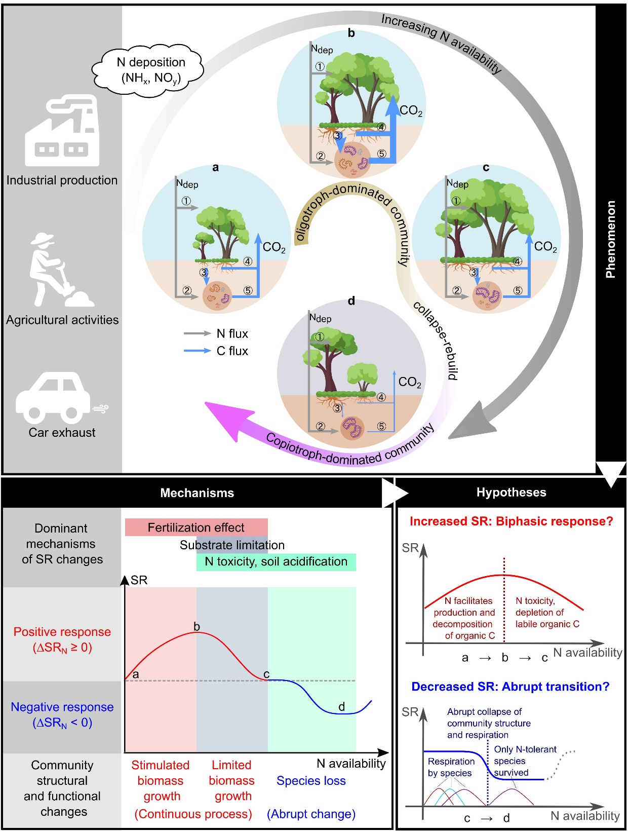 传统理论认为在氮饱和森林中,进一步的氮输入会抑制土壤呼吸。但在一些富氮森林和长期氮添加实验林中,仍有观测显示低剂量的氮输入促进了土壤呼吸。研究团队结合氮添加实验数据以及自然氮沉降梯度下的土壤呼吸观测数据,综合评估氮沉降对土壤呼吸的促进和抑制作用,发现氮输入对土壤呼吸的促进作用呈现双相效应,而氮输入对土壤呼吸的抑制作用呈临界突变效应(图5)。相比氮限制森林,氮饱和森林中出现氮输入抑制土壤呼吸的概率更高。当前的氮沉降水平导致全球2.9%的森林区域土壤呼吸下降。这些森林主要是中国东部、西欧和美国东部的氮饱和森林。然而,氮沉降的净效应使全球森林土壤呼吸增加了约5%(1.7 ± 0.1 PgC yr–1)。若能有效控制氮污染,全球森林土壤呼吸将下降,这可能有助于减少陆地碳排放。相关成果详见Cen et al. (2025a)。