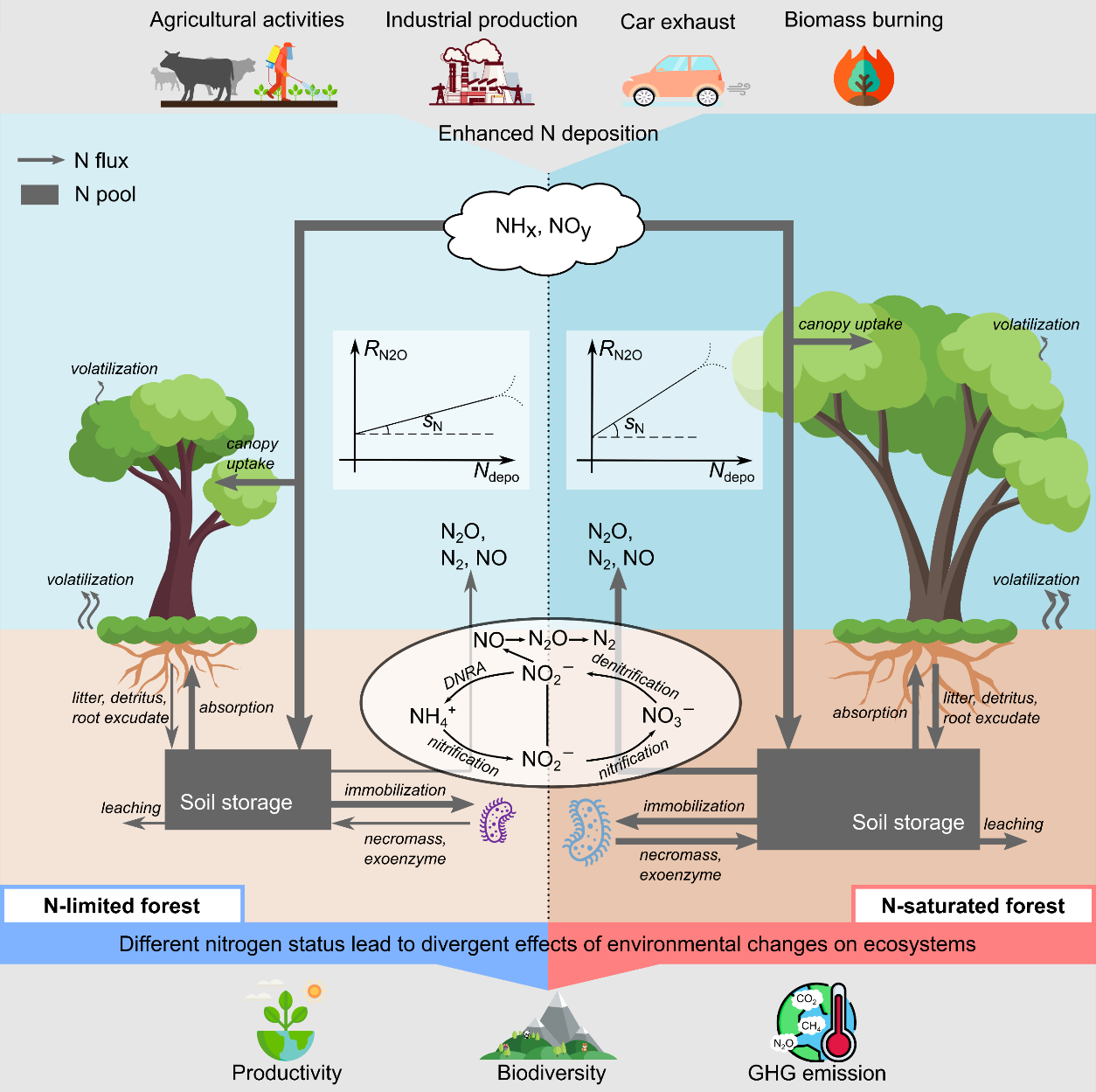 理论上,生态系统是否氮饱和对其碳氮循环具有重要影响(图1),但受方法学限制,人们一直无法给出氮饱和森林的空间分布图。如何科学、定量地评估氮沉降对森林土壤温室气体通量的影响也成为困扰学界多年的难题。何念鹏团队通过从文献中系统性整合的全球氮添加实验数据和温室气体通量数据,提出了新的研究框架基于“土壤N2O排放对氮沉降的敏感性”来确定了森林氮饱和状态,首次给出了全球氮饱和森林空间图,并以此为基础,探索了全球森林土壤三种温室气体对氮输入的响应规律,定量评估了氮沉降对森林土壤温室气体通量的影响及其空间格局,揭示了氮沉降对氮限制、氮饱和森林土壤温室气体收支的差异性影响。在该领域取得了以下几方面重要进展:
