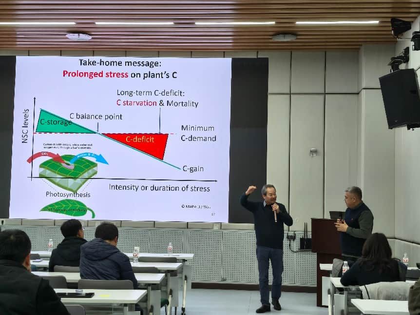 2026年3月6日下午,东北林业大学成栋生态讲坛(第二十八讲)在林科楼112会议室成功举行。本次讲坛特邀瑞士联邦森林、雪和景观研究所资深科学家李迈和教授担任主讲嘉宾。李迈和教授以“Root carbon shortage leads to mortality of stressed trees ”为题,给广大师生带来了精彩的学术报告。本次报告会由生态学院何念鹏教授主持。