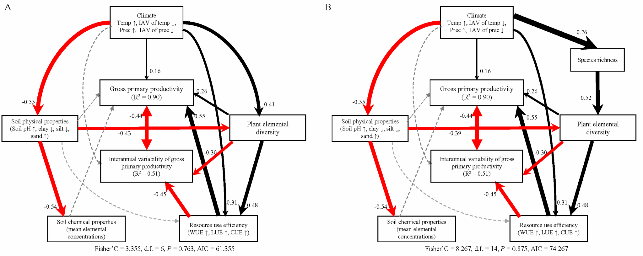 图中(A)为基准模型,(B)为纳入物种丰富度后的扩展模型。气候(Climpc1)、土壤物理性质(Soilpc1)和土壤化学性质构成主要非生物因子,植物元素多样性和资源利用效率为关键生物因子。黑色箭头表示正效应,红色箭头表示负效应;实线表示显著路径,虚线表示不显著路径;箭头宽度代表效应强度,数字为标准化路径系数。