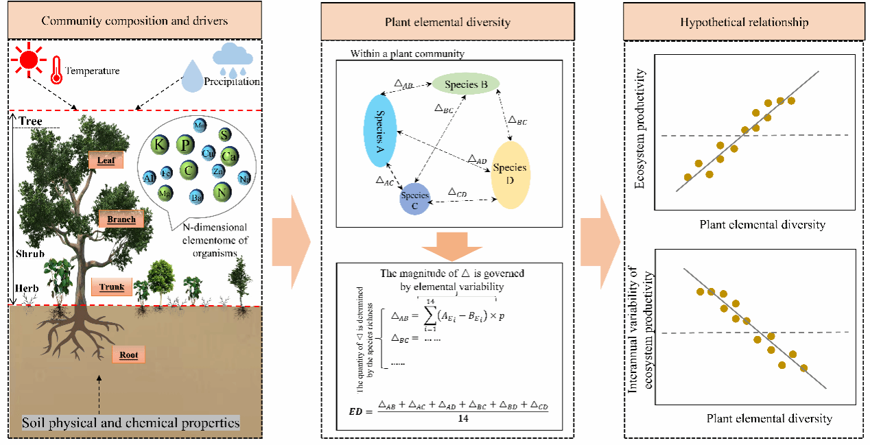 这一研究表明,除了传统的物种多样性、功能多样性和系统发育多样性之外,植物元素多样性同样能够有效刻画群落内部的功能异质性与生态位分化,并在预测生态系统生产力和稳定性方面展现出独特价值。该成果为揭示生物多样性与生态系统功能之间的关系提供了新的理论视角,也为全球变化背景下生态系统功能维持机制研究提供了新的科学基础。