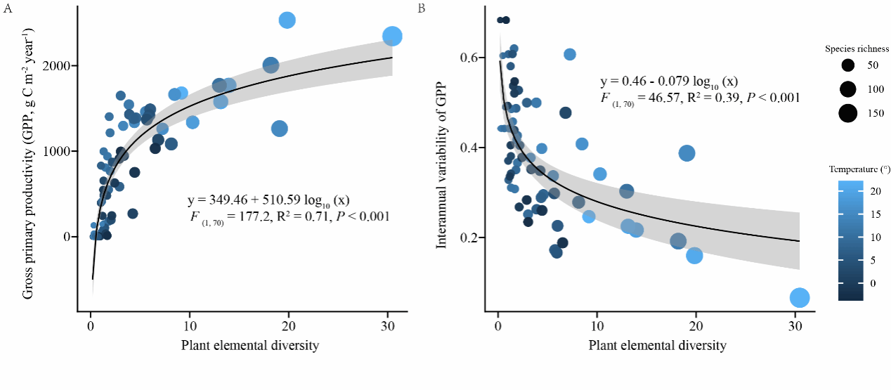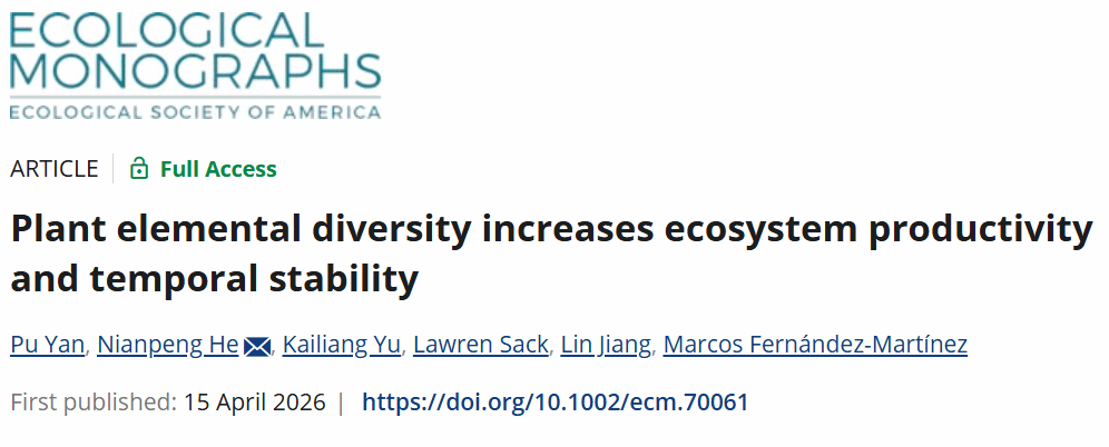 论文详情:Yan, P., N. He, K. Yu, L. Sack, L. Jiang, and M. Fernández-Martínez. 2026. Plant elemental diversity increases ecosystem productivity and temporal stability. Ecological Monographs 96: e70061.